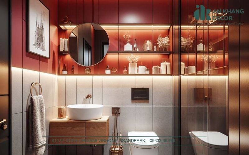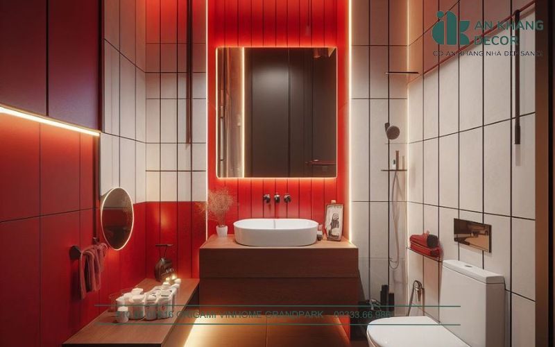 Thiết kế nhà tắm hiện đại thường tập trung vào sự tối giản nhưng không kém phần tinh tế. Các tông màu trung tính thường được ưu tiên kết hợp với tông đỏ Burgundy chủ đạo vì tạo cảm giác sạch sẽ và sang trọng. Gạch lát chống trơn và dễ lau chùi được chọn cho sàn, còn các tường thường được ốp đá hoặc gạch men cao cấp để hạn chế ẩm mốc và dễ bảo trì.