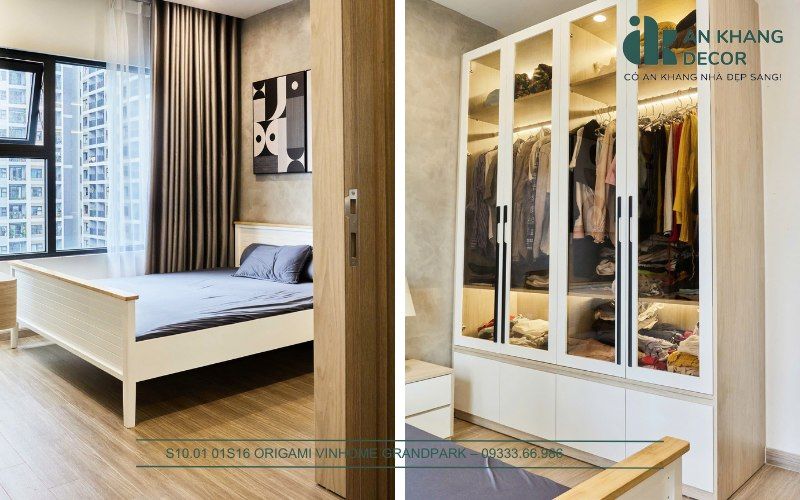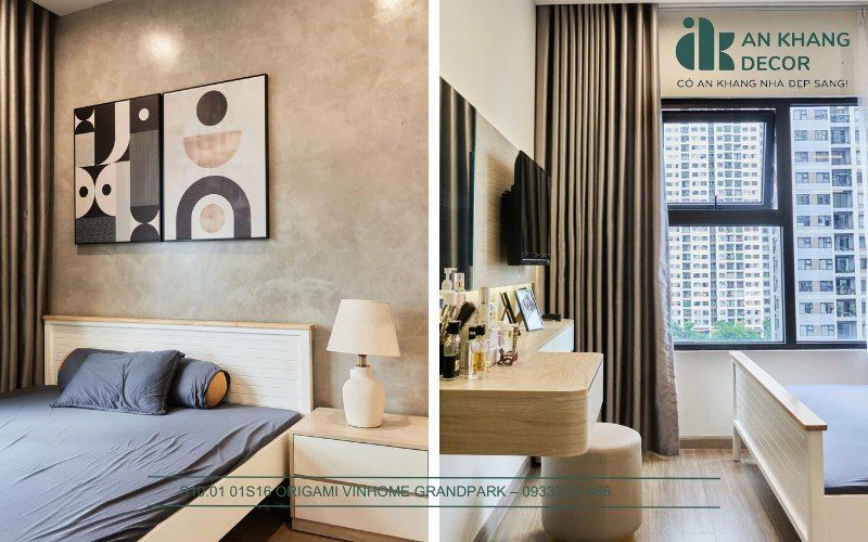 Hiểu được điều đó, An Khang Decor đã lựa chọn phong cách tối giản với gam màu sáng như trắng, kem, pastel để tạo cảm giác rộng rãi. Tiếp theo, ưu tiên sử dụng nội thất đa năng chẳng hạn như giường ngủ có ngăn kéo chứa đồ, bàn làm việc kết hợp bàn trang điểm, hay những chiếc kệ treo tường để tiết kiệm diện tích sàn.