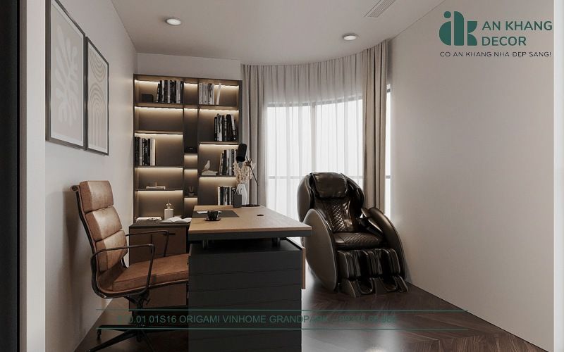 Ghế làm việc được chọn lựa kỹ lưỡng để đảm bảo sự thoải mái. Ngoài ra, An Khang Decor còn đề xuất còn tích hợp thêm một ghế massage nhỏ trong phòng, giúp gia chủ có thể thư giãn sau những giờ làm việc căng thẳng.