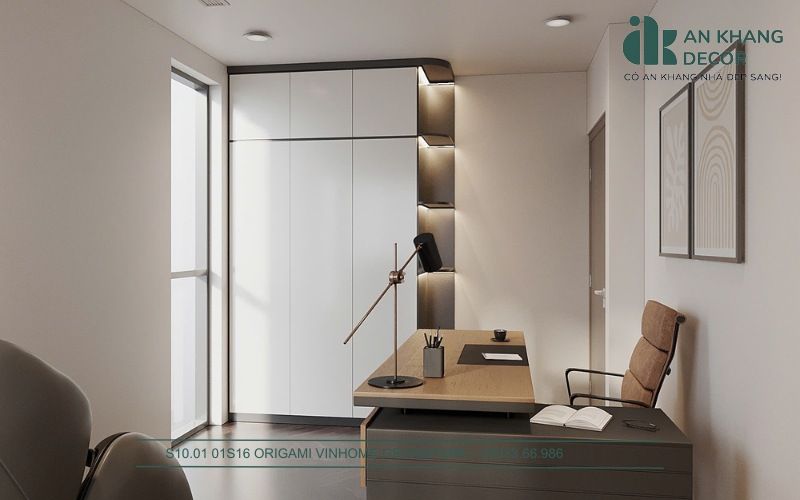 Phòng làm việc là nơi cần tạo ra cảm giác thư giãn nhưng vẫn hỗ trợ tối đa cho công việc. Bàn làm việc được đặt cạnh cửa sổ để tận dụng ánh sáng tự nhiên, điều này giúp gia chủ không bị mỏi mắt khi làm việc trong thời gian dài. Kệ sách thiết kế hiện đại, tích hợp đèn LED giúp không gian vừa mang tính thẩm mỹ vừa hỗ trợ tốt cho việc đọc sách và làm việc.