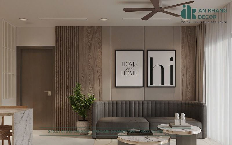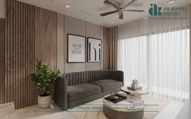 Phòng khách là nơi đầu tiên An Khang Decor muốn tạo ấn tượng với phong cách tối giản hiện đại. Tông màu trung tính là lựa chọn ưu tiên vì mang lại cảm giác thanh lịch và giúp không gian dễ dàng hòa hợp với các yếu tố trang trí khác. Sofa bọc nỉ cao cấp không chỉ mang lại sự thoải mái mà còn là điểm nhấn mềm mại trong không gian phòng khách. Bàn trà với mặt đá vân mây tạo nét sang trọng và làm nổi bật sự tinh tế của căn phòng.