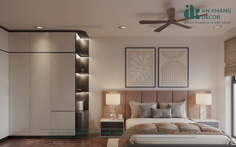 Với phòng ngủ, mục tiêu của chúng tôi là tạo ra một không gian yên tĩnh, nơi gia chủ có thể thư giãn tuyệt đối sau một ngày dài. Tông màu be và nâu trầm được sử dụng để mang lại sự ấm áp, thoải mái. An Khang Decor chọn giường bọc nệm mềm mại, tạo cảm giác êm ái và dễ chịu.