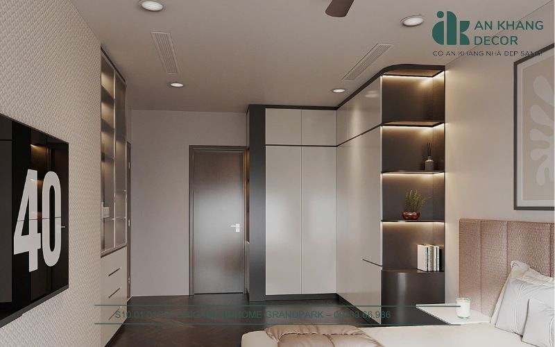Hệ thống tủ quần áo được thiết kế âm tường giúp tối ưu diện tích và làm cho không gian trở nên gọn gàng. Đèn ngủ được đặt ở hai bên giường để gia chủ có thể điều chỉnh ánh sáng dễ dàng khi cần thiết. Ngoài ra, cửa sổ lớn được trang bị rèm hai lớp, giúp gia chủ kiểm soát ánh sáng tự nhiên, từ đó đảm bảo sự riêng tư mà vẫn duy trì không gian mở và thoáng đãng.